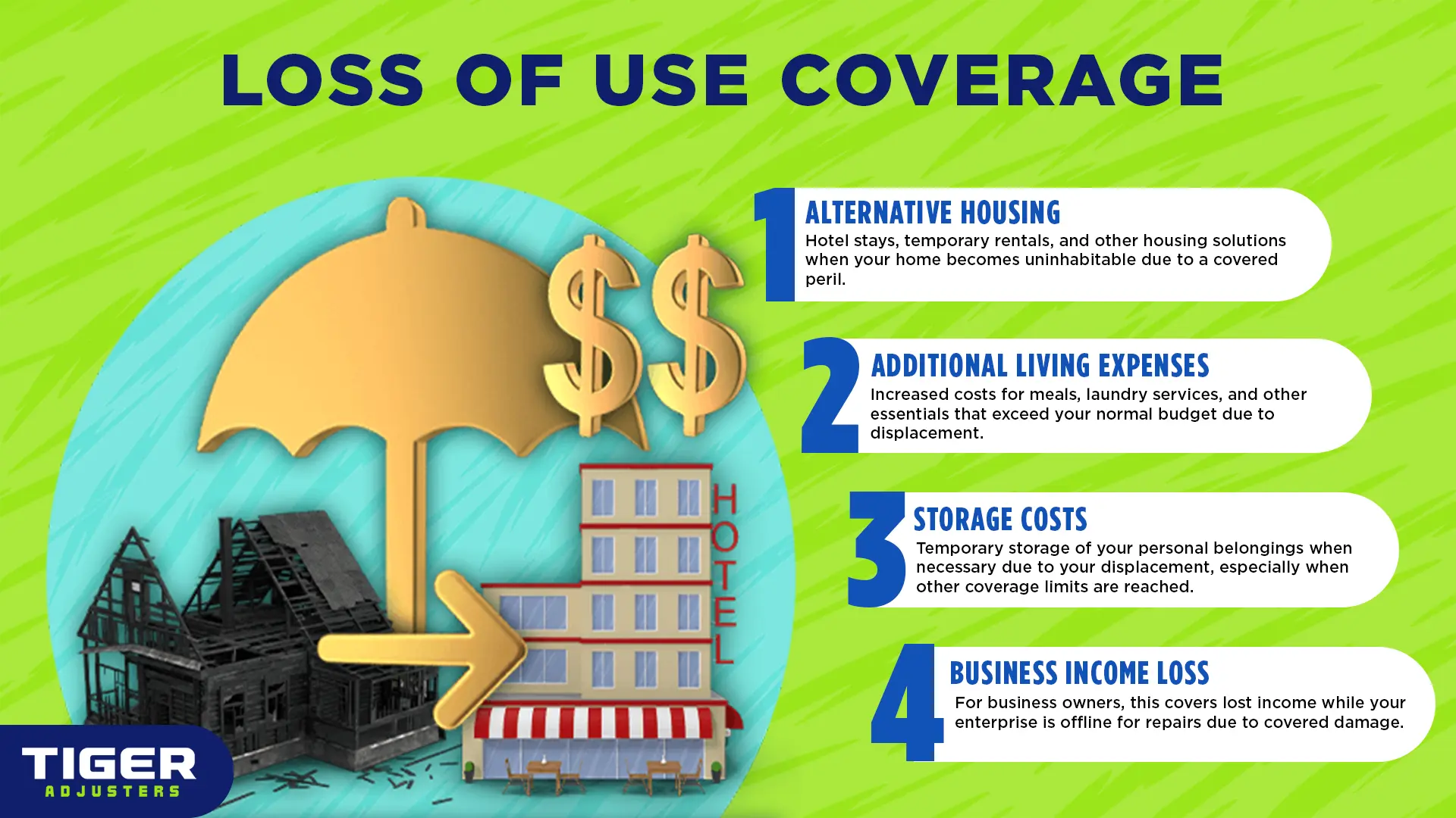 Within property insurance, "loss of use coverage" is the part of a policy that provides benefits when a policyholder can't live in their home or operate their business due to a covered peril.